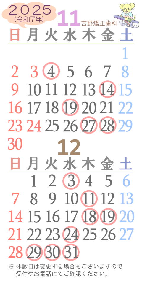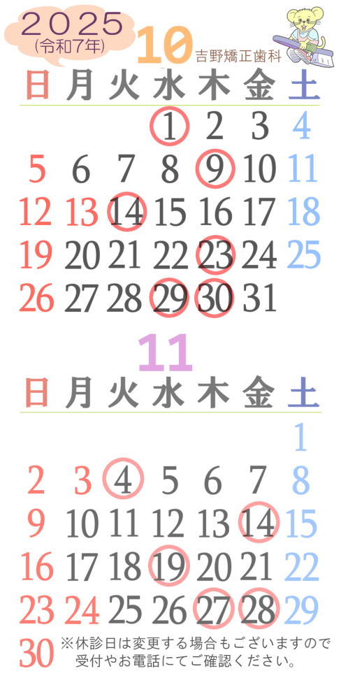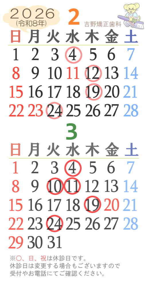 診療時間:平日 AM 9:50〜12:00 PM 1:50〜6:00 土曜 AM 9:50〜12:00 PM 1:20〜5:00 診療日は直前に変更になることがあります。 予約された方以外のご来院に当たっては、来院前にお問い合わせください。 ※医院の都合にて診療時間が短くなる日もございますが、ご了承のほどよろしくお願いいたします。